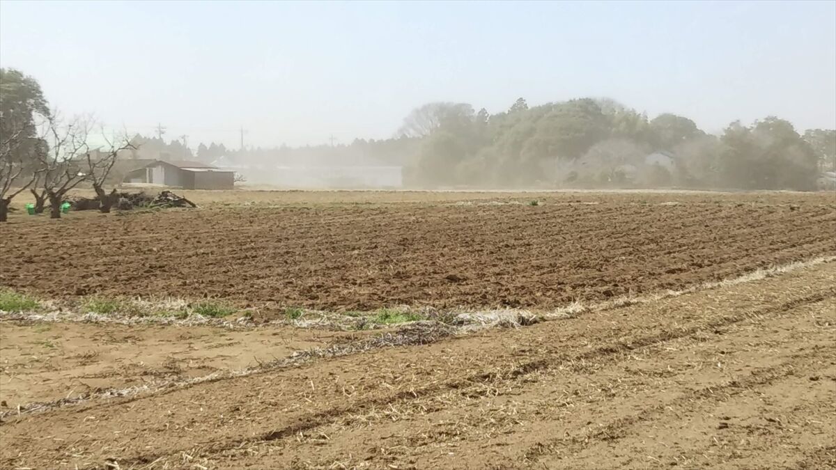 今日3/18日は強い北西の風が吹き荒れ畑の土が巻き上げられてました。霞ヶ浦も少しかすんでいました。